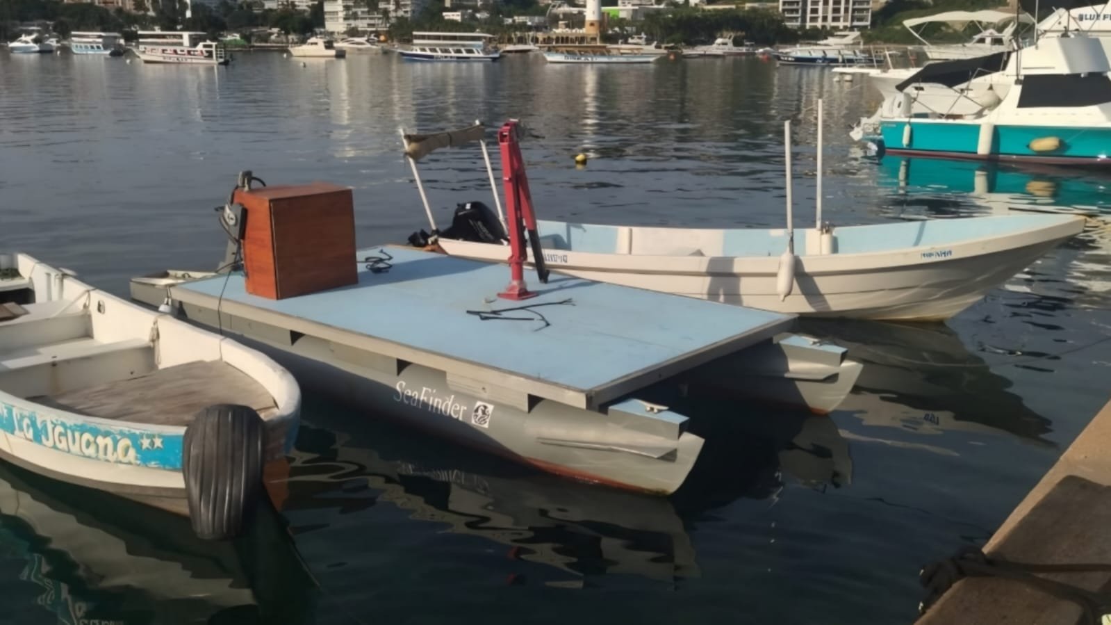 El equipo de SeaFinder compró en febrero de este año un pequeño catamarán que había encallado en la Laguna de Tres Palos, el cual remodelaron y adaptaron como una pequeña plataforma.