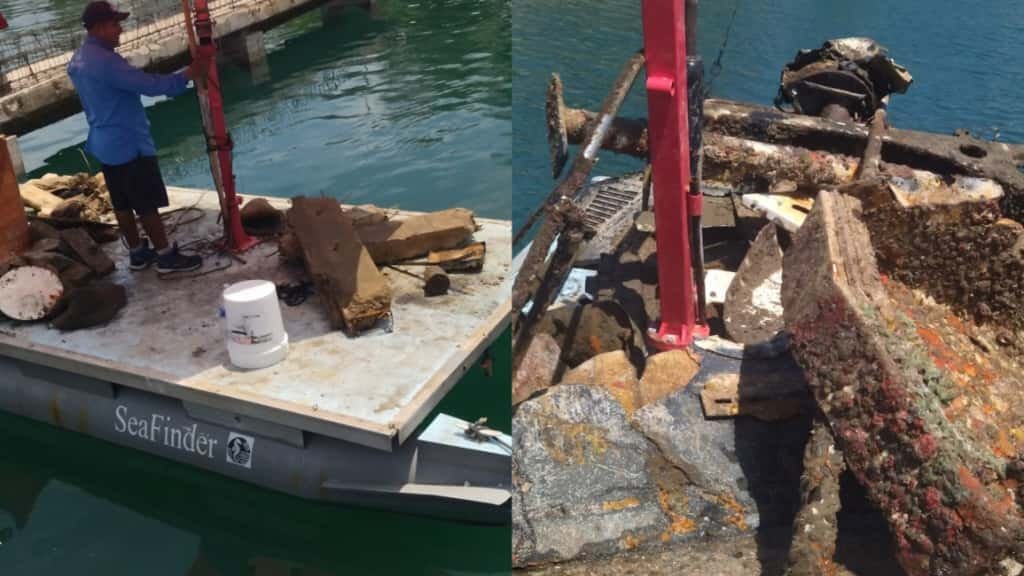 Las primeras pruebas fueron solo con buzos, quienes con sus mano levantaban del fondo marino los restos hundidos. Tras prueba y error, SeaFinder adaptó una pequeña grúa con la que puedan levantar 200 o 300 kilos.