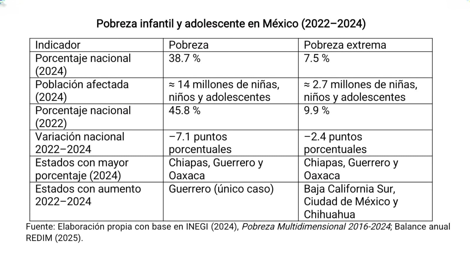 Por otra parte, cerca del 25 % se encuentra en pobreza extrema, es decir, alrededor de 275 mil infantes y adolescentes (INEGI, 2024; Red por los Derechos de la Infancia en México [REDIM], 2025). Esta información ubica a Guerrero como uno de los estados con mayores problemas de pobreza y extrema pobreza, sobre todo cuando se menciona que entre el 2022 y 2024 hubo una reducción considerable.