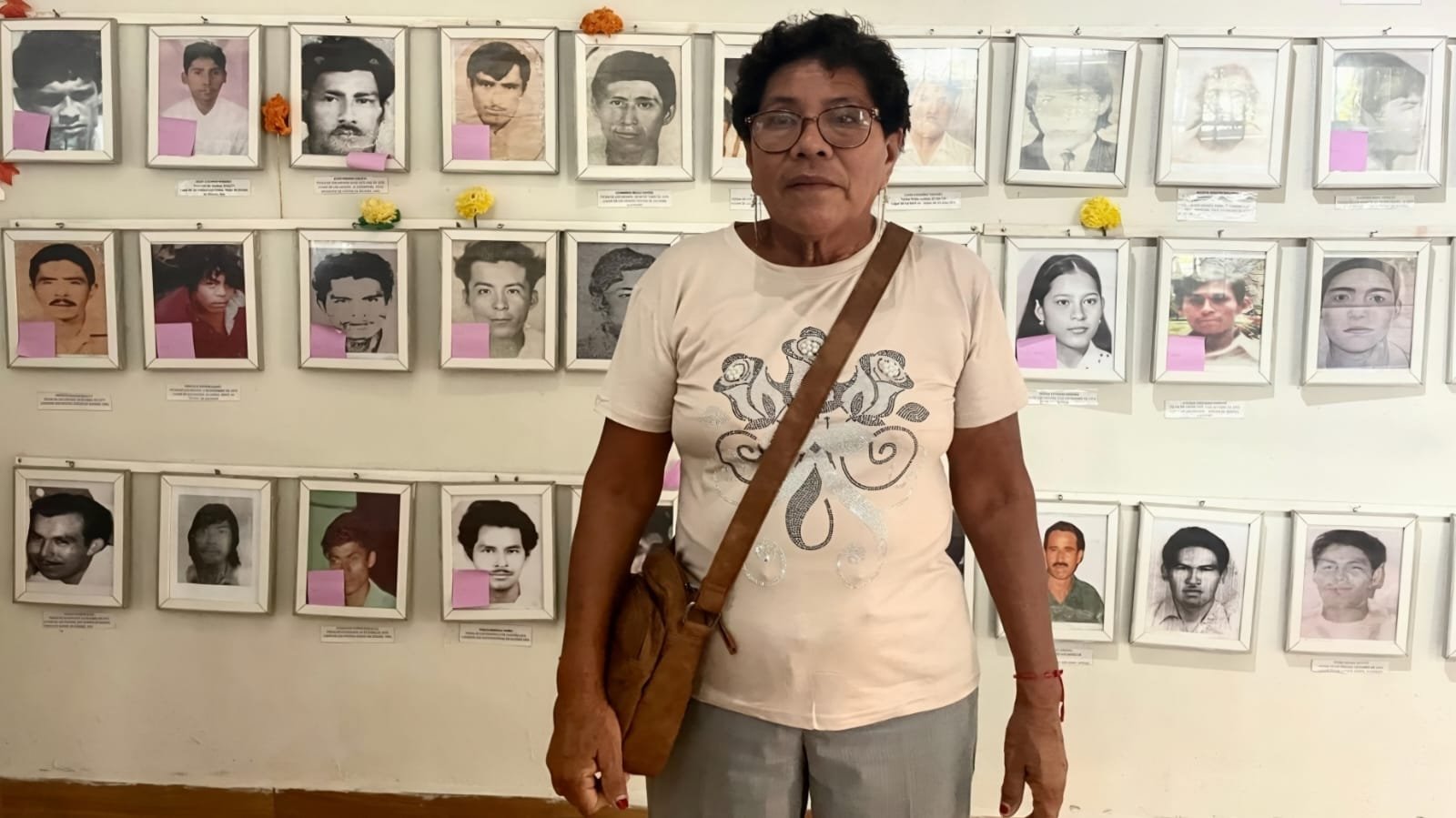 María Argüello Vázquez está parada frente a la tumba de Esteban Mesino y Lino Rosas, combatientes que murieron a lado del profesor Lucio Cabañas Barrientos, en El Otatal, en la sierra de Tecpan, el 2 de diciembre de 1974, tras un enfrentamiento con el Ejército. En ese mismo ataque, fue detenido por militares Marcelo Serafín Juárez, un adolescente de 14 años, que hasta ahora está desaparecido.