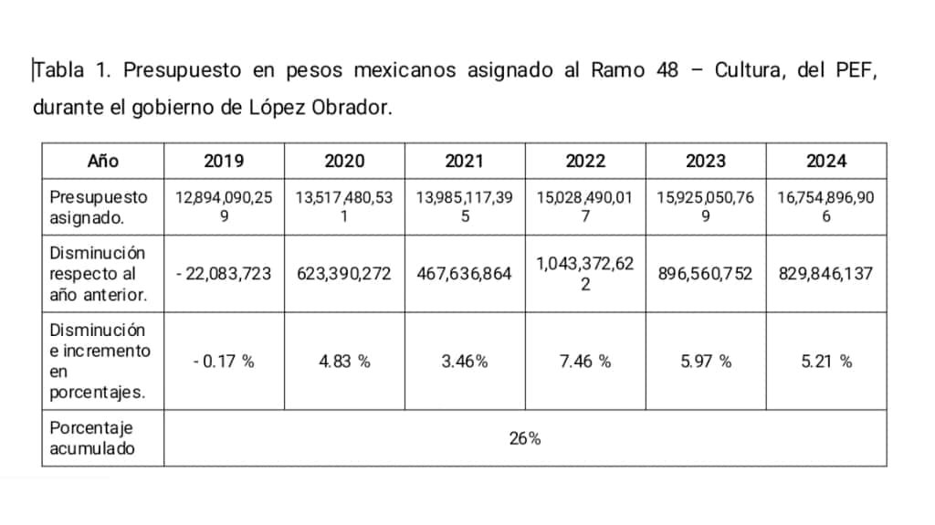 Esto sucedería en caso de aprobarse el Proyecto de Presupuesto de Egresos de la Federación para el Ejercicio Fiscal 2026; siendo así, tendríamos que mientras durante los seis años de gobierno de López Obrador hubo un incremento acumulado de 26% al Ramo 48 (recuérdese que en 2019 hubo un pequeño decremento), en dos años Sheimbaum habrá disminuido el presupuesto en 23.14%, es decir, le faltaría 3.62% para anular el incremento presupuestal que durante la gestión de López Obrador se concedió al Ramo cultura.