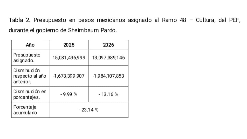 En este año 2025, varias instituciones como el INBAL, INAH, INEHRM, Radio Educación, Instituto Nacional del Derecho de Autor e Instituto Nacional de Lenguas Indígenas, entre otros, les ha sido disminuido su presupuesto, y en el 2026, tal parece que habrá otra disminución para ellos.